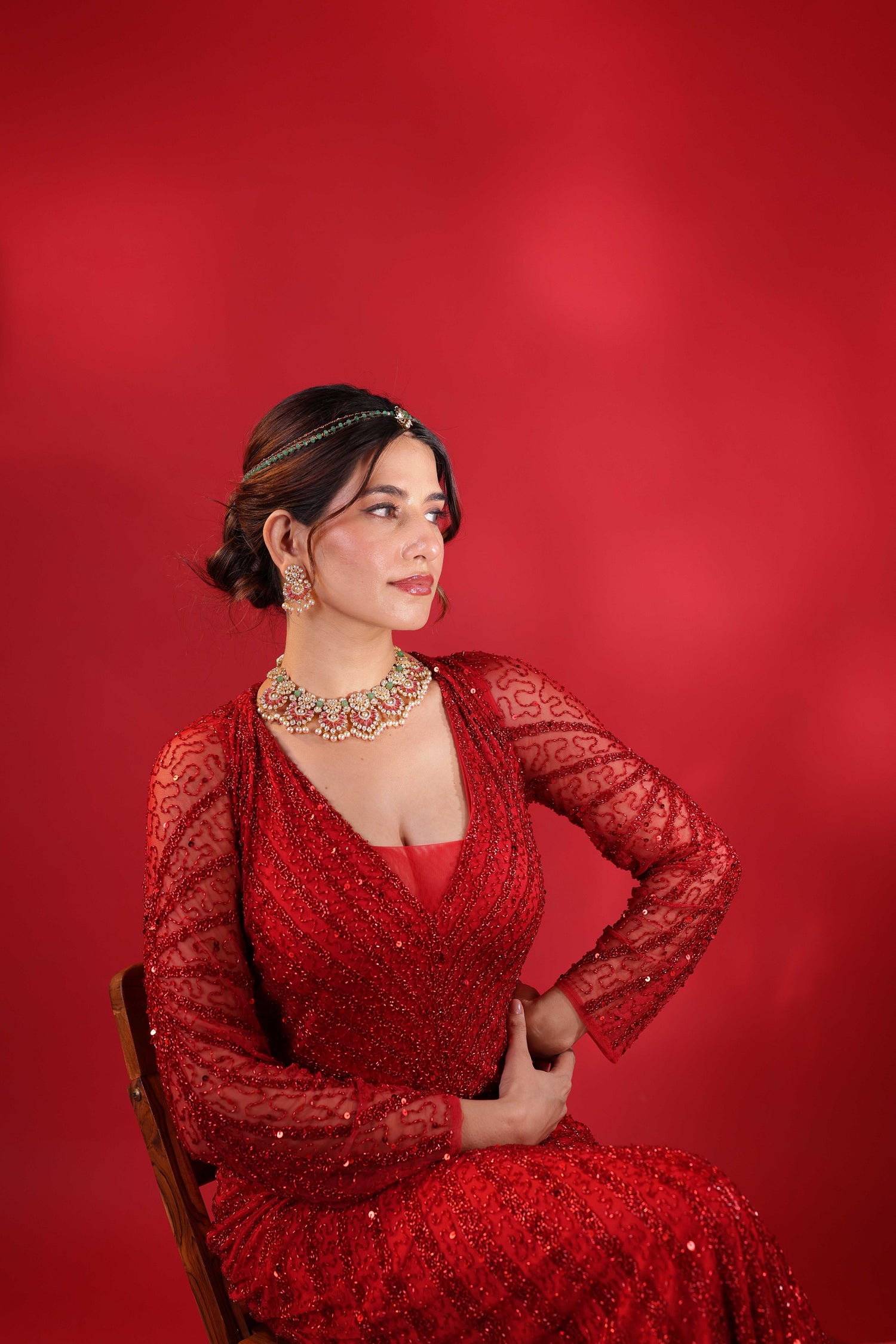 The Bhavana Choker Necklace is a breathtaking masterpiece, meticulously detailed with handcrafted polki and shimmerin...