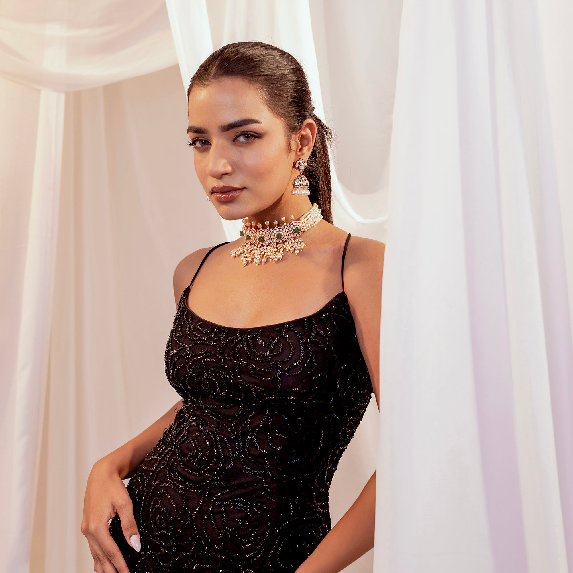 The Ayusha Emerald Choker is a captivating fusion of color and craftsmanship, with Victorian finish. This 1.0 Micron ...